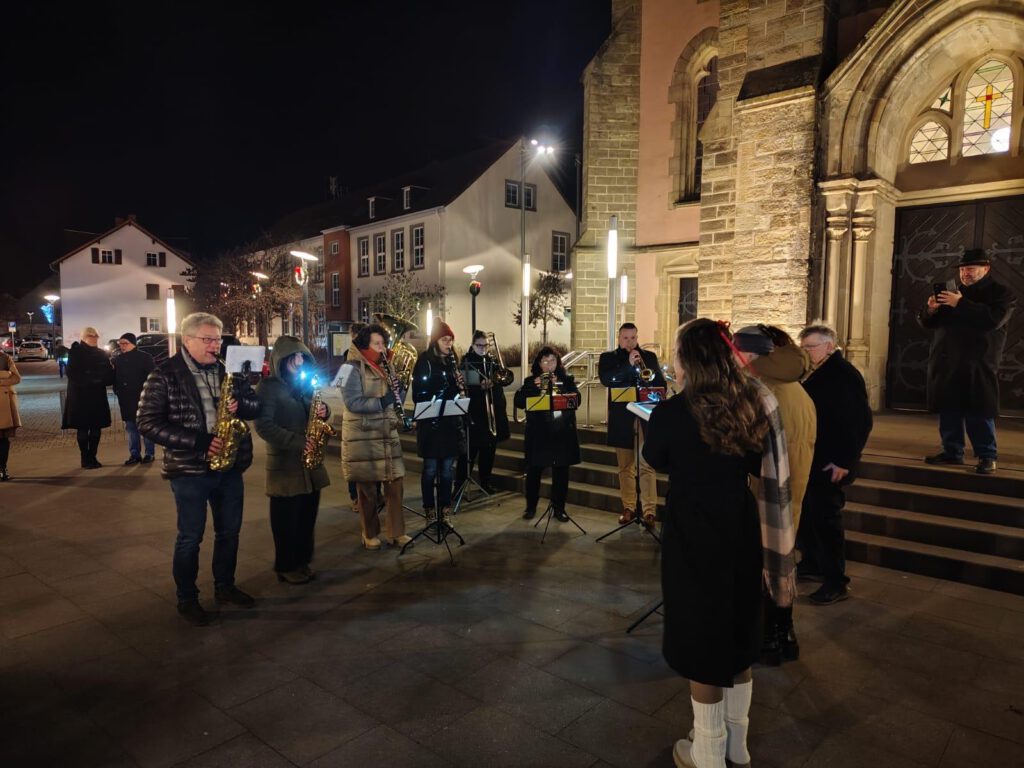 Wie jedes Jahr spielten einige unserer Musiker/-innen nach der Heiligabendmesse noch vor der Kirche St. Maximin Weihnachtslieder und bereiteten somit einigen Kirchenbesuchern noch eine kleine Freude. Ein eisiger Wind wehte und die ein oder anderen Notenblätter verabschiedeten sich zwischenzeitlich, aber wir haben der Kälte getrotzt. Anschließend konnten sich alle umso mehr auf das Festessen und die Bescherung im warmen Wohnzimmer zu Hause freuen.