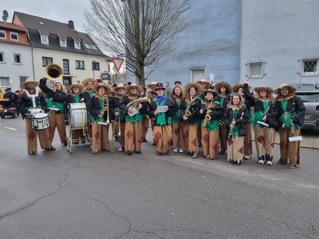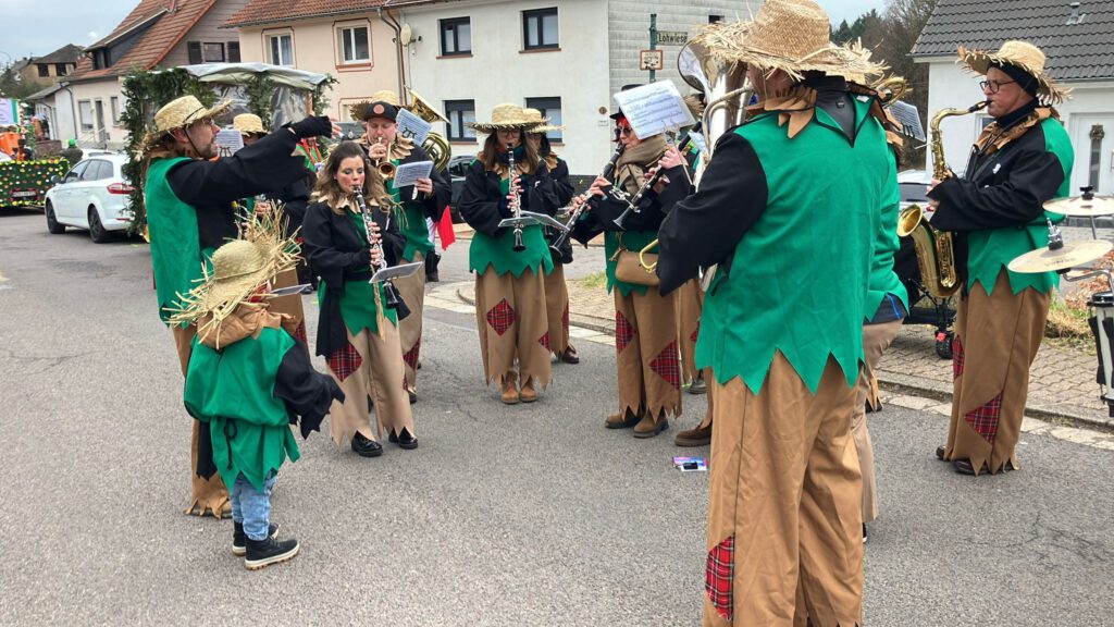 An Fetten Donnerstag ging es weiter. Diesmal jedoch als Vogelscheuchen beim Dillinger und Freitag beim Dieffler Umzug. Das wechselhafte Wetter hatte keinen Einfluss auf die Stimmung. Querbeet gespickt mit Roten Rosen für Mama Lauda und Cordula Grün sagten die Musiker in Dillingen Bella Ciao auf der Wegstrecke vom Hoyerswerda-Platz bis zur Römerhalle. Man musste zum Glück nicht eine Woche wach bleiben, um die gleichen Hits durch die Schlung bis zum Gemeindehaus in Diefflen zu hören.